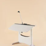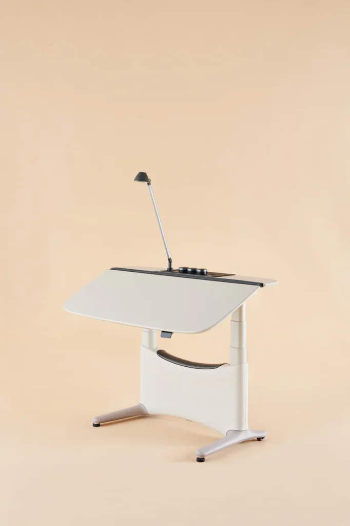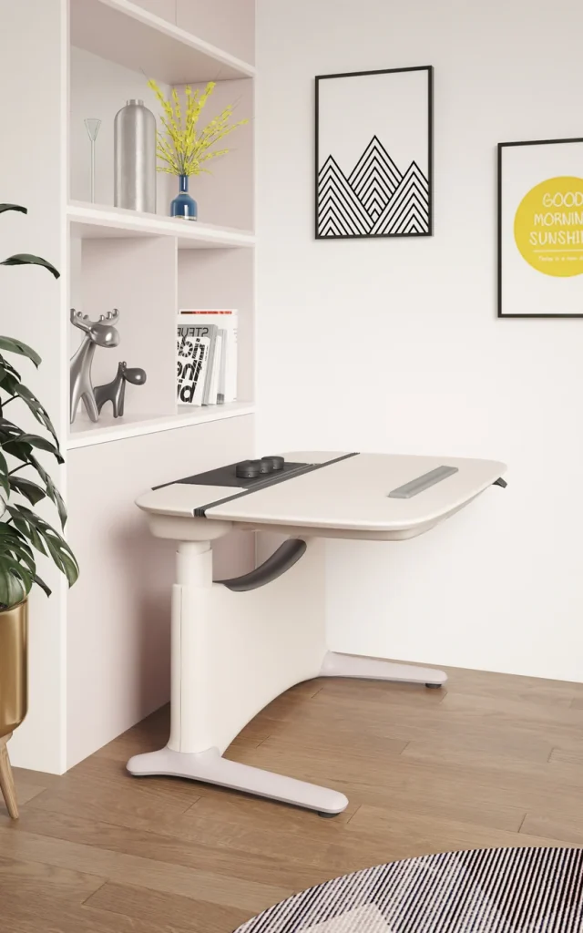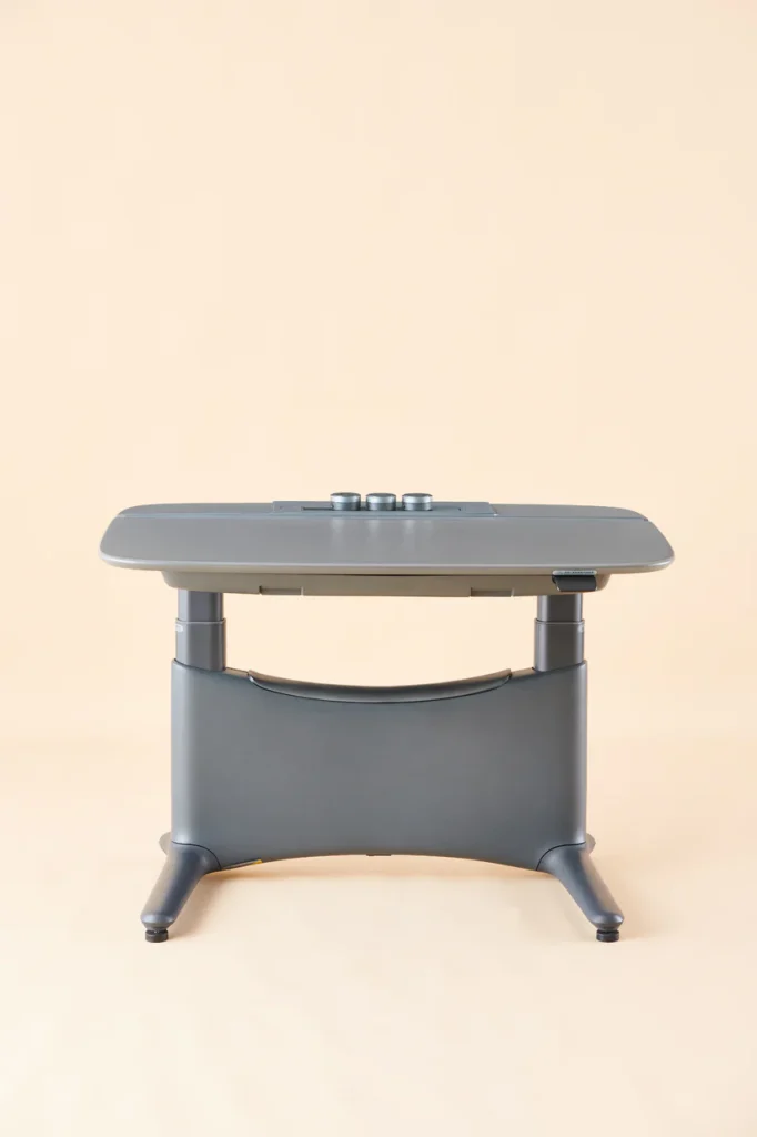 採用氣壓調節系統,桌面角度可自由調整,支援水平至垂直多角度設置。智慧感測器精準控制,防止桌面傾斜至危險角度。